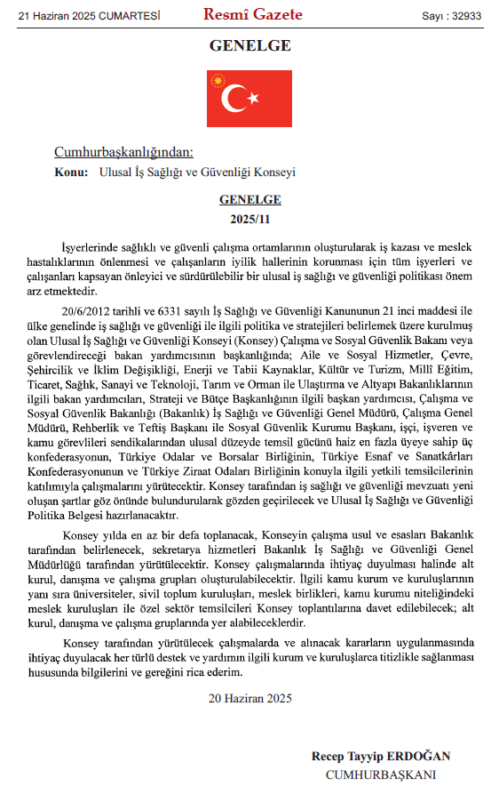 21.06.2025 tarihinde yayımlanan 32933 sayılı Resmî Gazete‘de, “Ulusal İş Sağlığı ve Güvenliği Konseyi ile İlgili 2025/11 Sayılı Cumhurbaşkanlığı Genelgesi” yer aldı. Bu genelgeye göre, iş sağlığı ve güvenliği alanında daha planlı ve etkin çalışmalar yürütülmesi amacıyla, Ulusal İş Sağlığı ve Güvenliği Politikası oluşturulmasının önem arz ettiği belirtilmektedir.